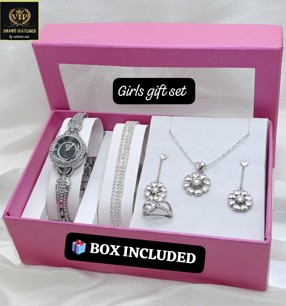 Make every moment special with this elegant Luxury Girls Gift Set, beautifully packed in a premium pink box. This stunning combo includes a stylish gold watch paired with matching jewelry pieces, designed to add charm and sophistication to any look.